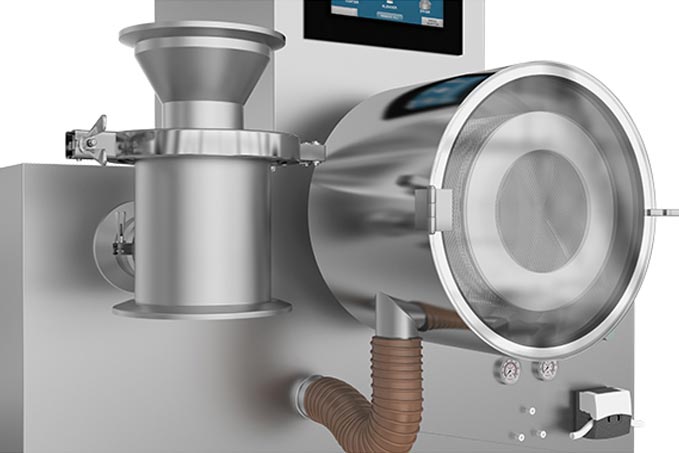Geared to handle lots of 50g to 5kg. Featuring the R-mini nozzle, the laboratory-scale of Gansons proprietary GHPN IIIRD nozzle, Gansons OEM peristaltic pump, Gansons proprietary baffles and signature smooth, perforated pan.