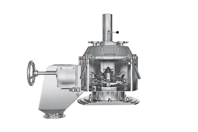 The multi-blade impeller assembly creates a uniform shear environment throughout the product mass, eliminating dead zones that force conventional granulators to extend mixing time. The co-axial scraper keeps all material in the active shear zone throughout the cycle.