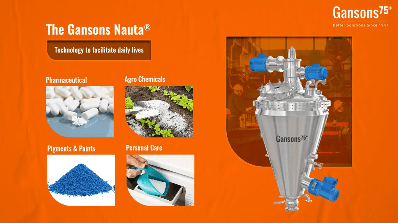 The Gansons Nauta® is a gentle, three-dimensional conical screw mixer used across a wide range of industries including pharmaceuticals, food, chemicals, paints, pigments, cosmetics, fragrances, carbon black, petrochemicals, crop protection, and animal feed. It mixes without generating heat or mechanical damage, making it ideal for fragile, thermolabile, or high-value materials. Gansons is one of only two official licensees of Nautamix B.V. (Holland) in the world, with over 1,000 units sold across more than 40 years.